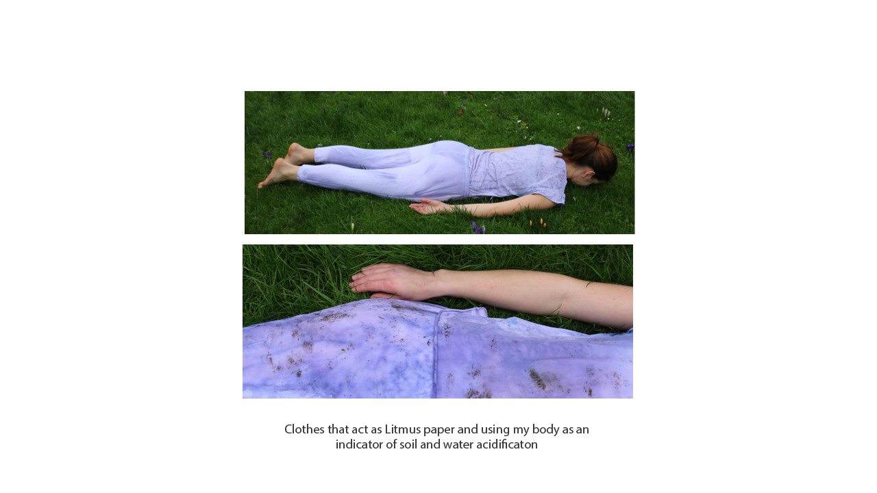 This project aims to make the invisible effects from climate change such as acidic rains and resulting acidic soils visible. For this I created a biodegradable litmus plastic that would change colour when in contact with acidic or alkaline substances. In order to address how humans come in directs contact with acidic rain I decided to use clothes and my own body to measure the environments pH levels. My body then comes in direct contact with a specific space and a statement for the invisible signs of climate crisis.
